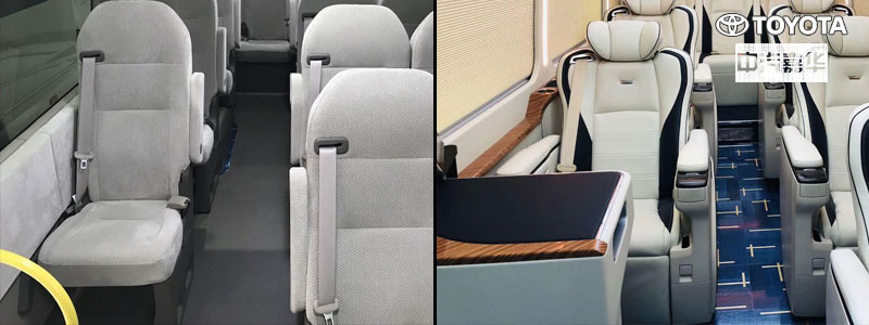 首先是座椅改装前后:改装前丰田考斯特的座椅为丝绒座椅,外观看起来有点土的掉渣,功能仅限座椅前后,且由于座位数较多,看起来较为拥挤;改装后换上埃尔法原装航空座椅,黑白相间的真皮包裹使得整个座椅更加现代时尚,同时宽大的座位空间和固定扶手凸显舒适大气,加上按摩、通风、电动前后、辅助桌板、电动腿托等可与飞机豪华头等仓座椅比肩。
